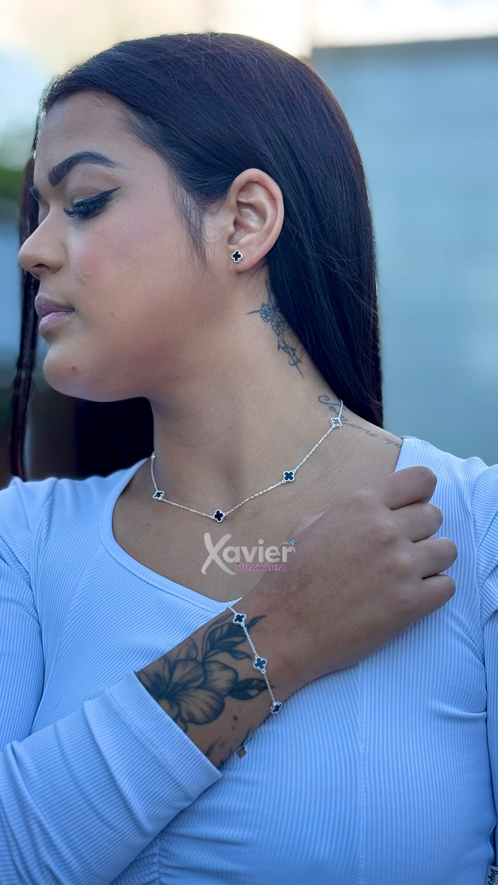 Descubra a elegância do Conjunto Colar, Pulseira e Brinco Modelo Trevo, confeccionado em prata legítima 925. Este conjunto sofisticado apresenta uma pedra sintética na cor preta, perfeita para qualquer ocasião.